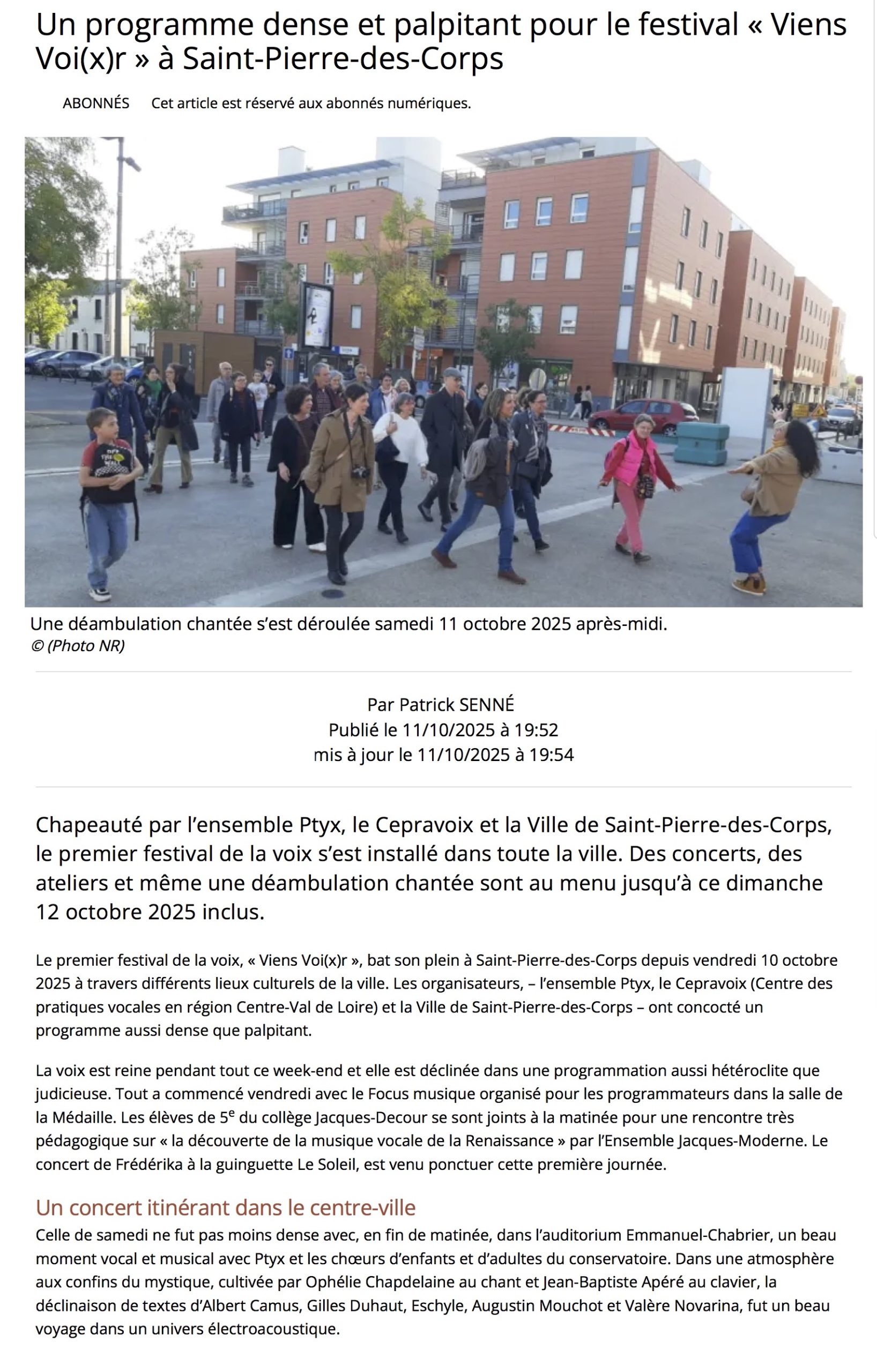 Dans le cadre du festival de la voix Viens Voi(x)r organisé par la Ville de Saint-Pierre-des-Corps, l’ensemble Ptyx et Cepravoi, plusieurs rendez-vous sont programmés les 10, 11 et 12 octobre. « Ce festival est une invitation à explorer les frontières de la voix et des vocalités. C’est une expérience unique qui réunira les curieux de la voix, en solo ou en chœur, aux côtés d’ensembles amateurs et professionnels », évoquent les organisateurs. Des ateliers ouverts à tous sont organisés afin « de découvrir des formes vocales inédites tout en assistant, aux quatre coins de la ville, à des concerts inouïs sous le signe du partage et de la découverte ». Parallèlement au festival, vendredi 10 octobre toute la journée, aura lieu la rencontre Focus musique 2025 pour les ensembles professionnels. Viens Voi(x)r verra un grand temps fort avec le concert de l’ensemble Mikrokosmos sous la direction de Loïc Pierre.