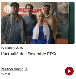 > Samedi 11 octobre. De 11 h à 12 h, auditorium du conservatoire, spectacle avec Ptyx (entrée libre sur réservation) ; de 14 h 30 à 16 h 30, ateliers de pratique à l’auditorium du conservatoire (6 € l’atelier, sur inscription) ; de 17 h 30 à 18 h 30, concert itinérant avec l’ensemble Ptyx, le chœur À Voix Hautes, ElaNaveVa et Passerelles (sur réservations), départ salle de la Médaille ; à 20 h, concert du chœur Mikrokosmos dans la salle des fêtes (9 et 15 €).